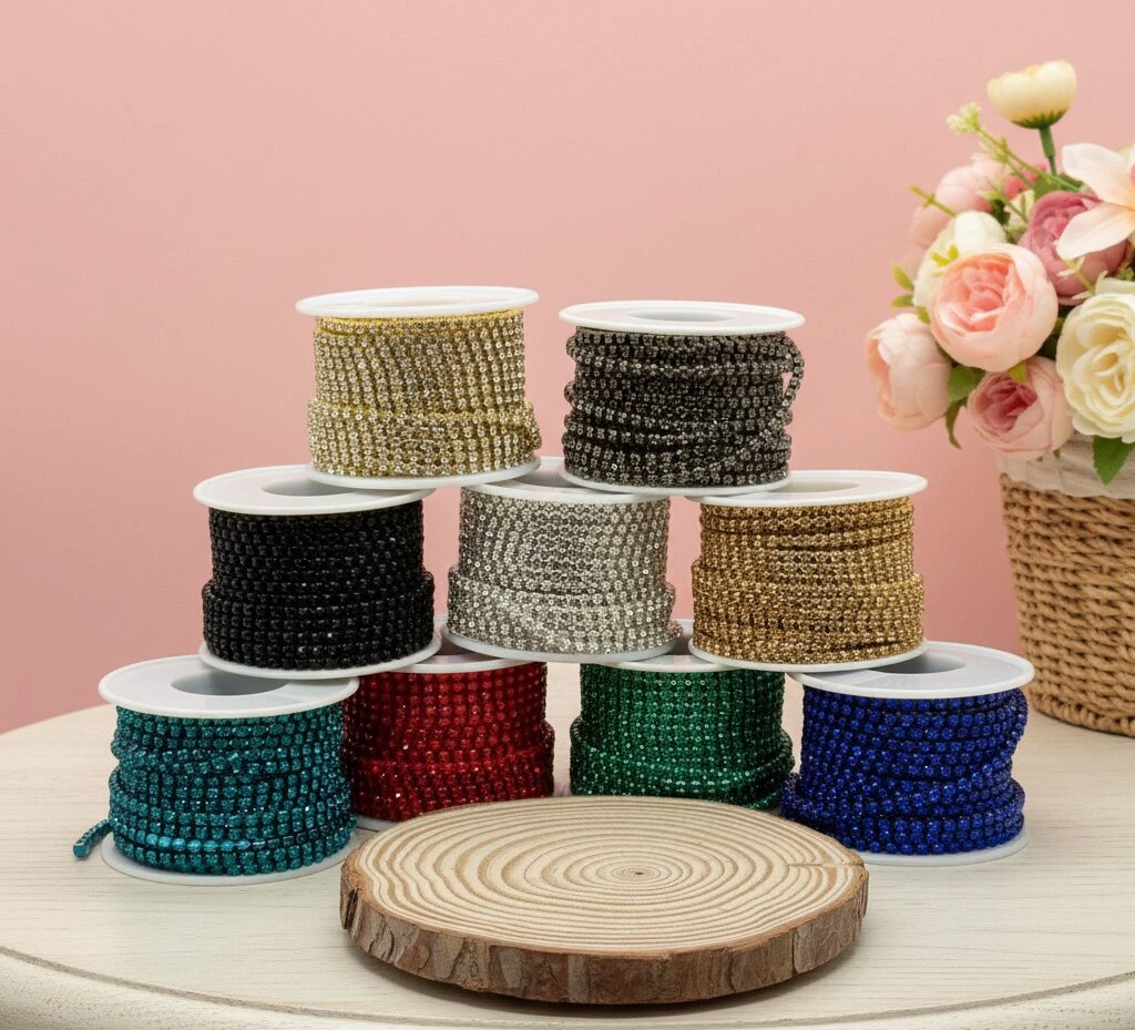 Цепи з каменями — декоративні елементи від Мереживо UA, що поєднують металеву основу та вбудовані камінці для яскравого блиску й ефектного вигляду. Вони легко прикріплюються до одягу, аксесуарів або виробів, створюючи стильний та розкішний декор.