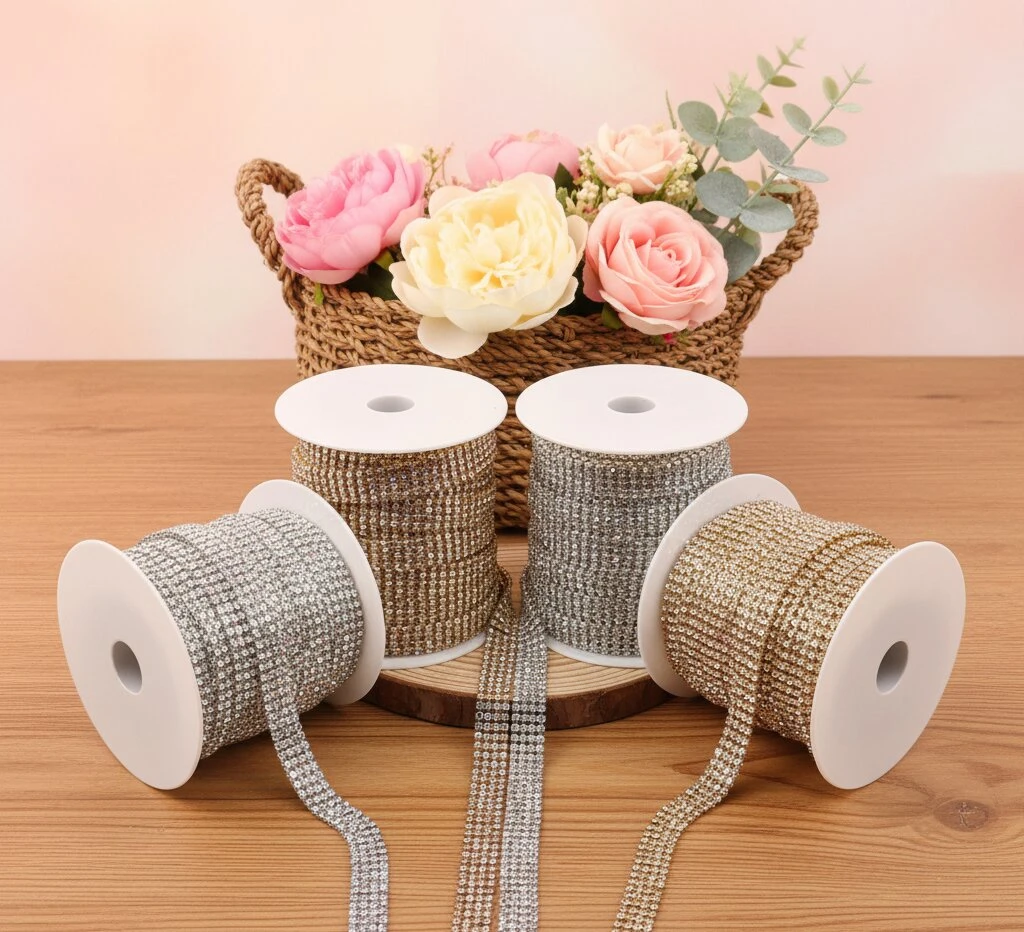 Цепи з каменями — декоративні елементи від Мереживо UA, що поєднують металеву основу та вбудовані камінці для яскравого блиску й ефектного вигляду. Вони легко прикріплюються до одягу, аксесуарів або виробів, створюючи стильний та розкішний декор.
