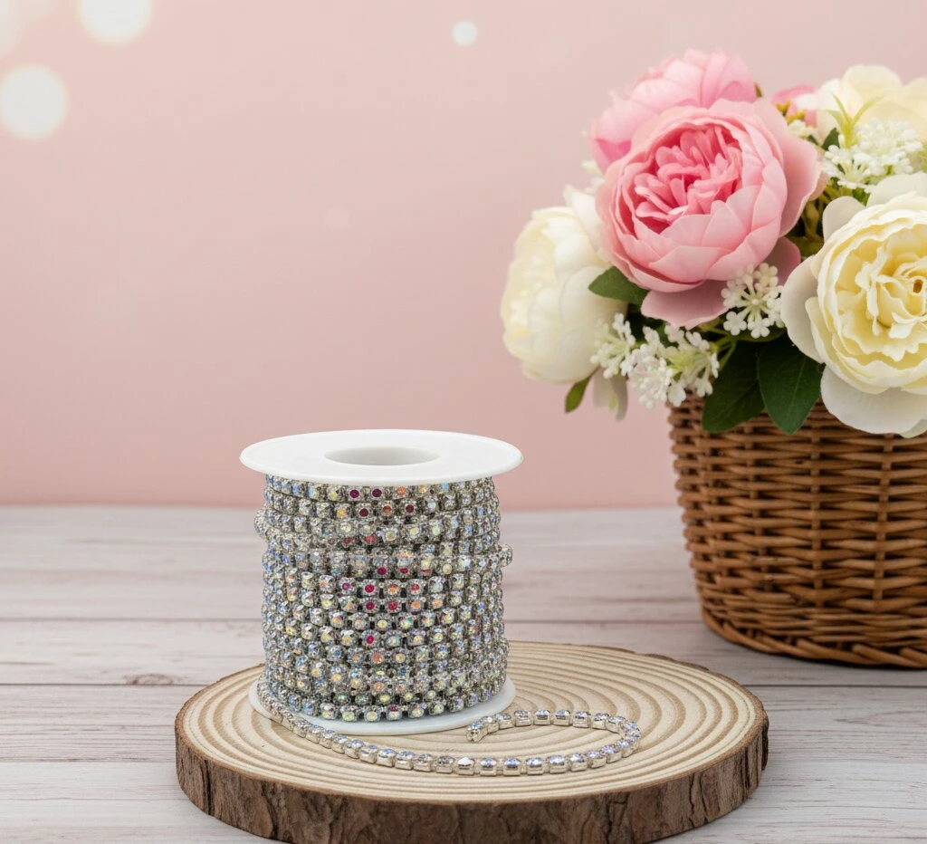 Цепи з каменями — декоративні елементи від Мереживо UA, що поєднують металеву основу та вбудовані камінці для яскравого блиску й ефектного вигляду. Вони легко прикріплюються до одягу, аксесуарів або виробів, створюючи стильний та розкішний декор.