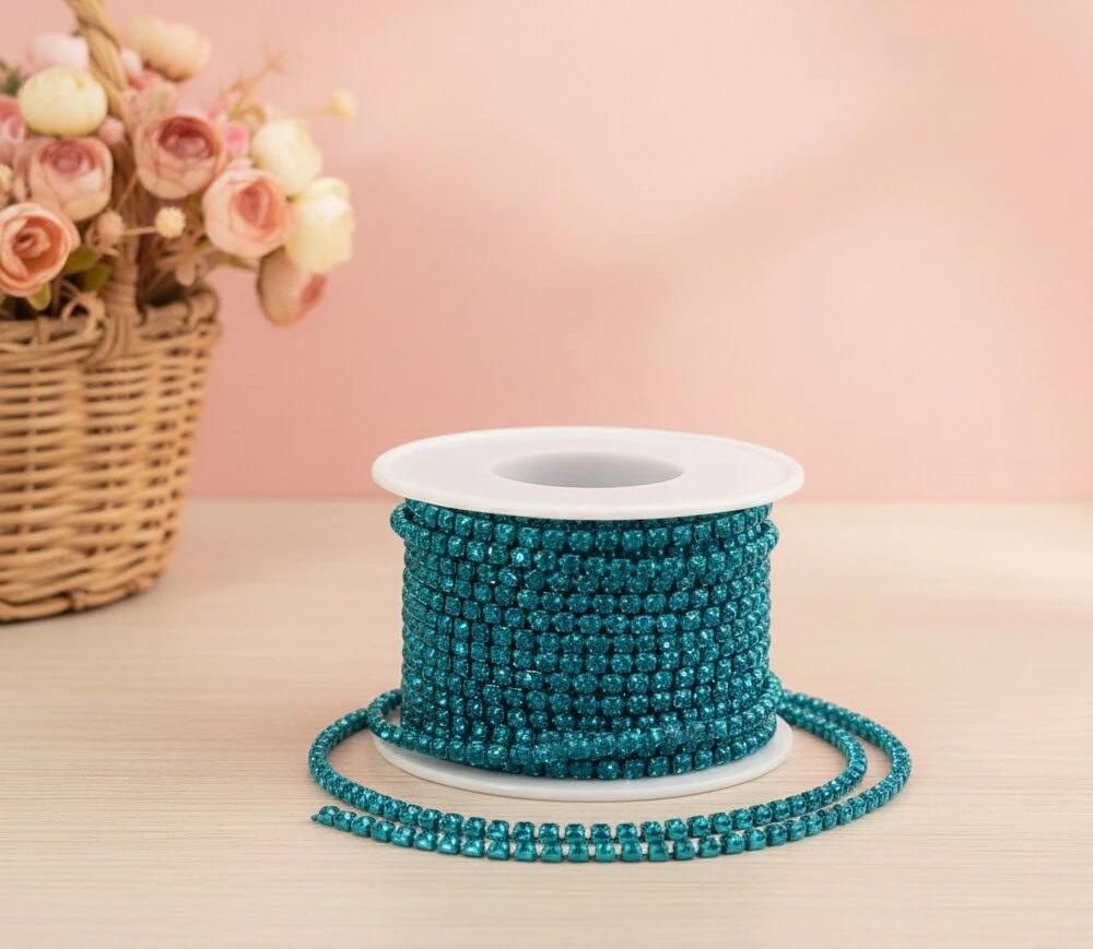 Цепи з каменями — декоративні елементи від Мереживо UA, що поєднують металеву основу та вбудовані камінці для яскравого блиску й ефектного вигляду. Вони легко прикріплюються до одягу, аксесуарів або виробів, створюючи стильний та розкішний декор.