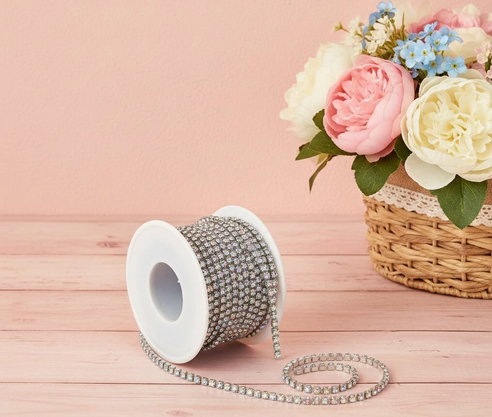 Цепи з каменями — декоративні елементи від Мереживо UA, що поєднують металеву основу та вбудовані камінці для яскравого блиску й ефектного вигляду. Вони легко прикріплюються до одягу, аксесуарів або виробів, створюючи стильний та розкішний декор.