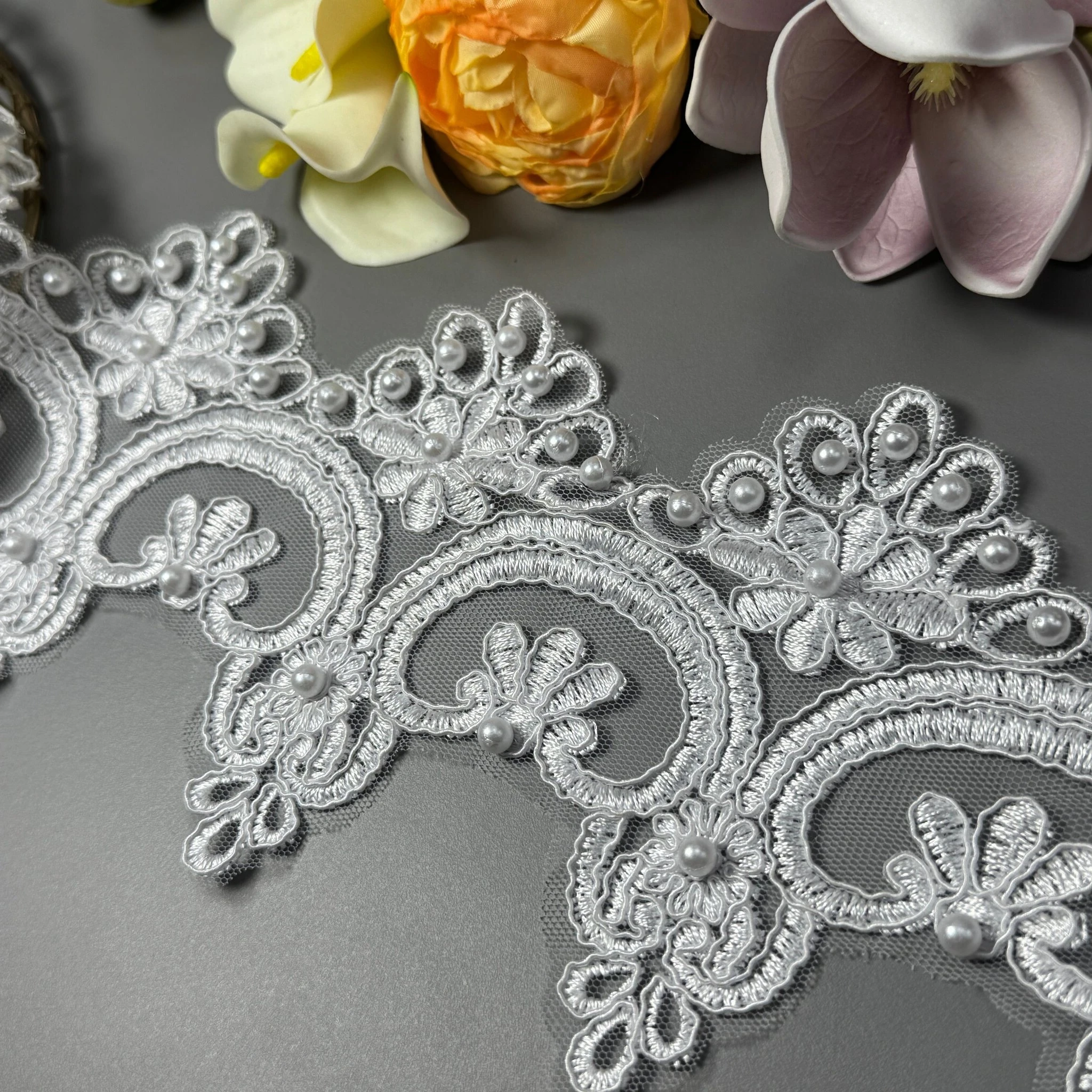 Мереживо з кордовою ниткою та перлами — декоративне мереживо з об’ємним візерунком із кордової нитки, прикрашене ніжними перлинами. Воно виглядає вишукано та святково, додаючи виробам розкоші та елегантності.