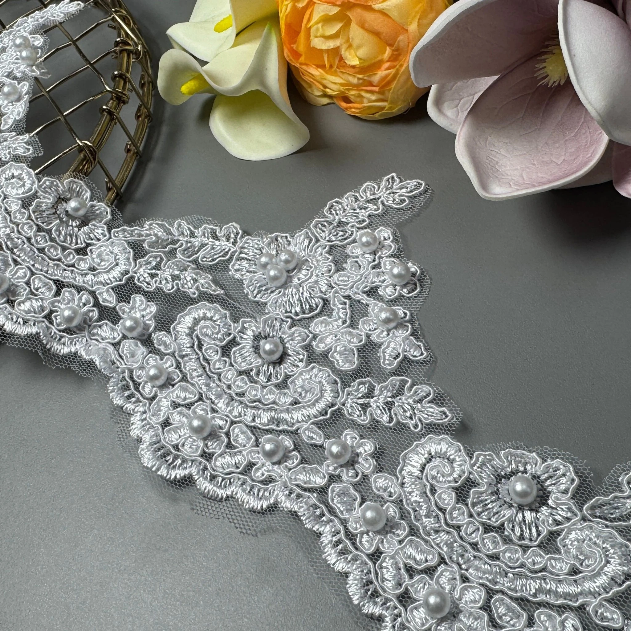 Мереживо з кордовою ниткою та перлами — декоративне мереживо з об’ємним візерунком із кордової нитки, прикрашене ніжними перлинами. Воно виглядає вишукано та святково, додаючи виробам розкоші та елегантності.