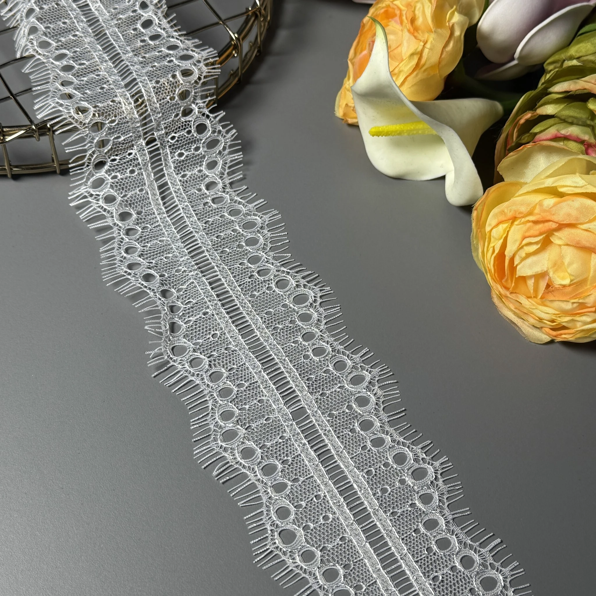 Ніжне плетіння, витончений візерунок і легкість тканини роблять це мереживо ідеальним для весільних суконь, вечірнього вбрання, білизни та елітного декору.