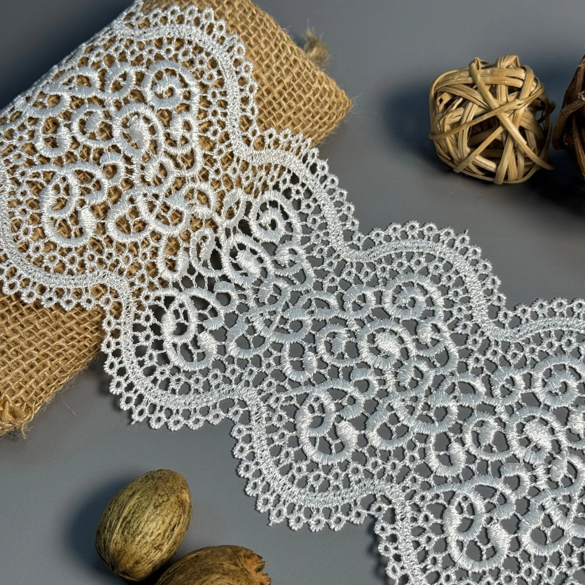 М’яке, міцне й зносостійке мереживо з поліестеру чудово підходить для оздоблення суконь, блуз, спідниць, білизни, аксесуарів та декору.