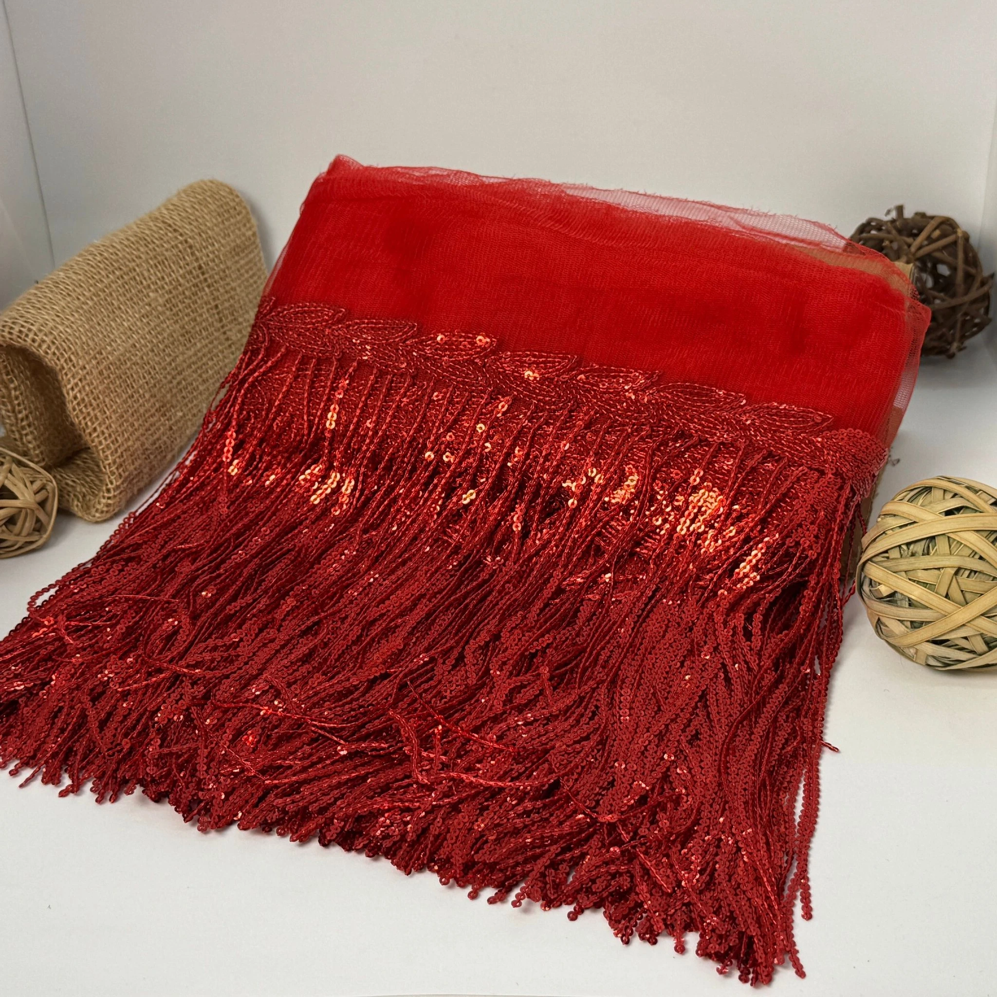 Бахрома танцевальная с пайетками на сетке «Искры страсти» 20 см (9.1 метр), 9 червоний