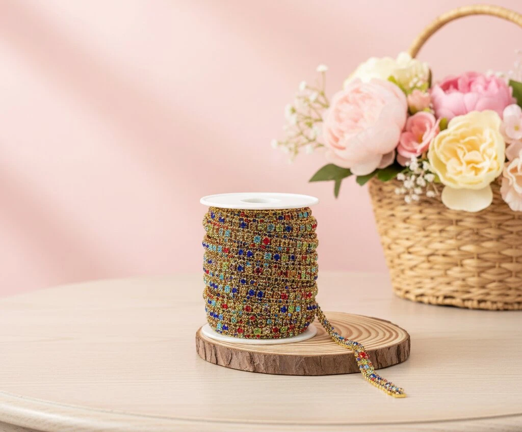Цепи с камнями — декоративные элементы от Мереживо UA, которые сочетают металлическую основу и встроенные камушки для яркого блеска и эффектного вида. Они легко крепятся к одежде, аксессуарам или изделиям, создавая стильный и роскошный декор.