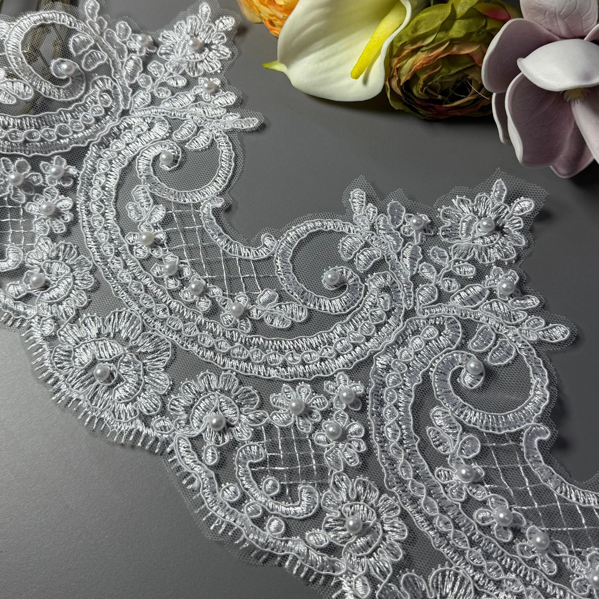 Кружево с кордовой нитью «Лавандовая мечта» + жемчуг 17 см (1 метр), білий