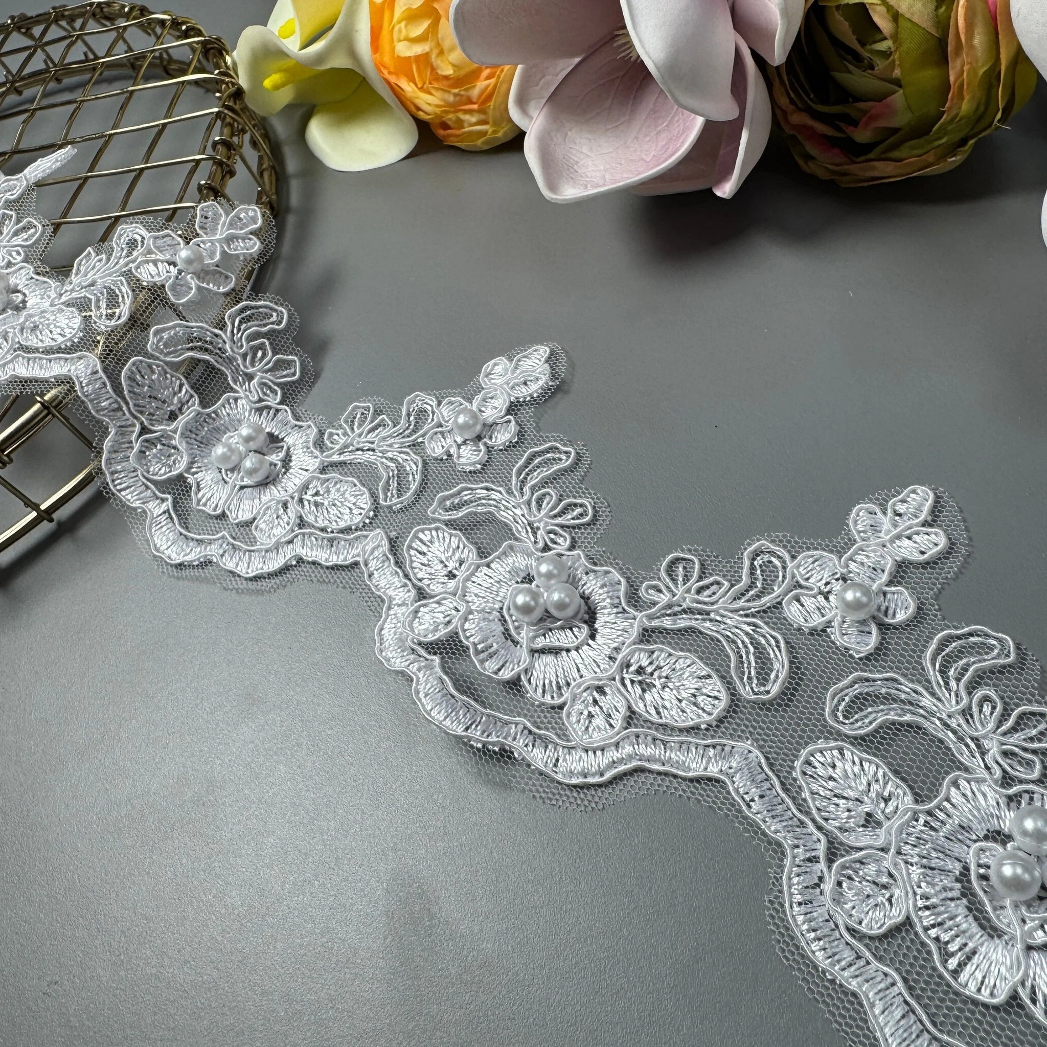 Кружево с кордовой нитью и жемчугом — декоративное кружево с объемным узором из кордовой нити, украшенное нежными жемчужинами. Оно выглядит изысканно и празднично, придавая изделиям роскоши и элегантности.