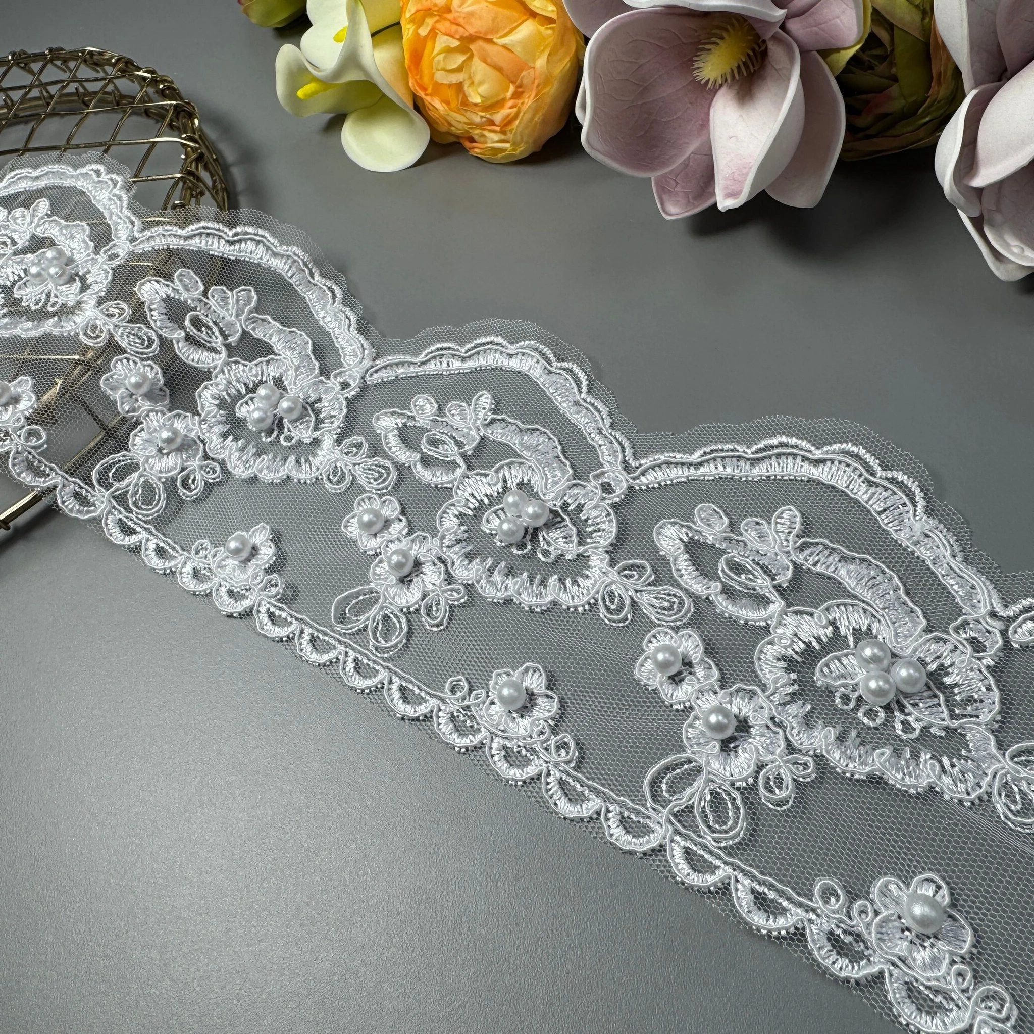 Кружево с кордовой нитью«Солнечный сад»А+жемчуг 10,5 см(1 метр), білий