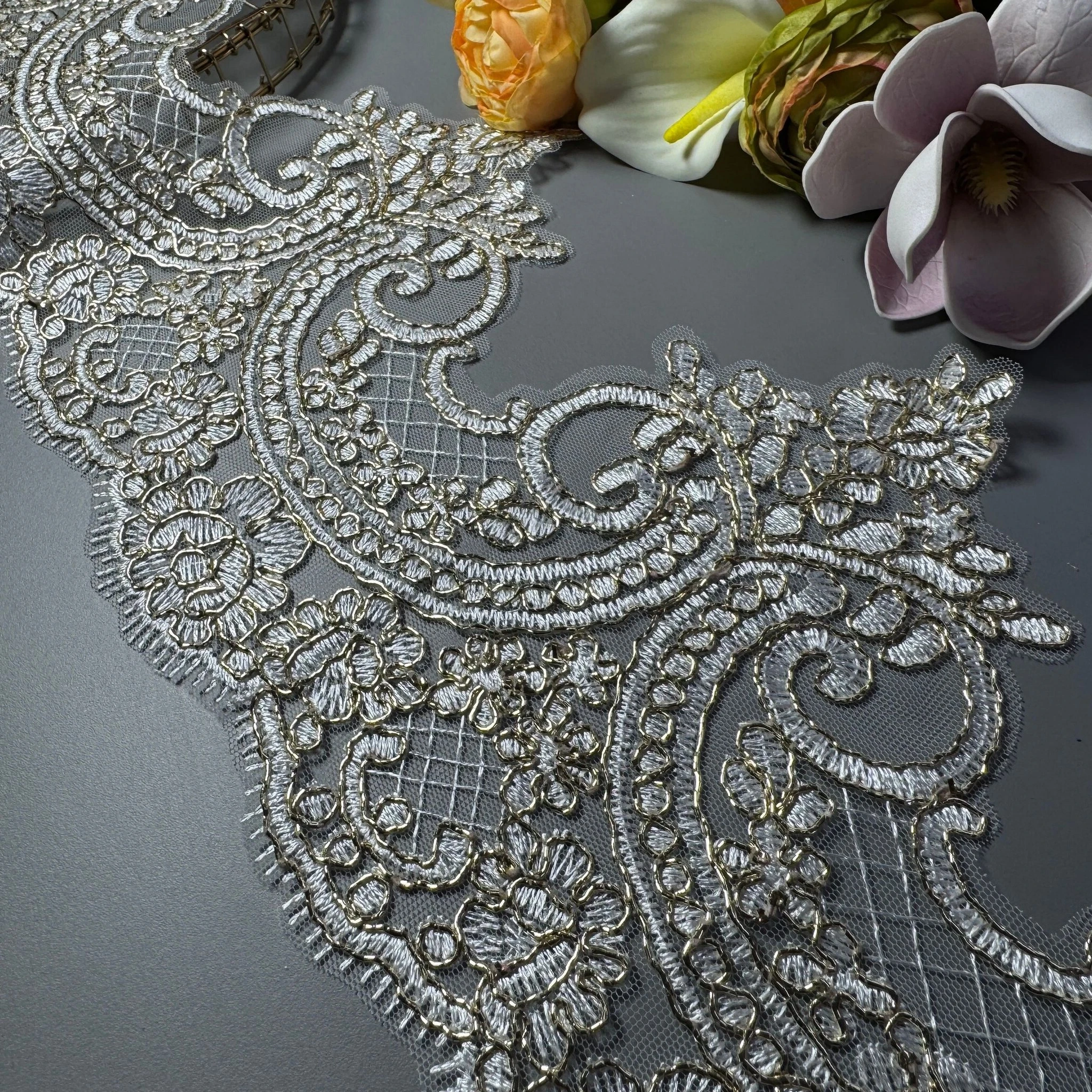 Кружево с корд-нитью и люрексом — изысканное декоративное кружево с объемным узором из корд-нити и блестящими вставками из люрекса. Оно выглядит праздничным и элегантным, добавляя изделиям роскоши и очарования.