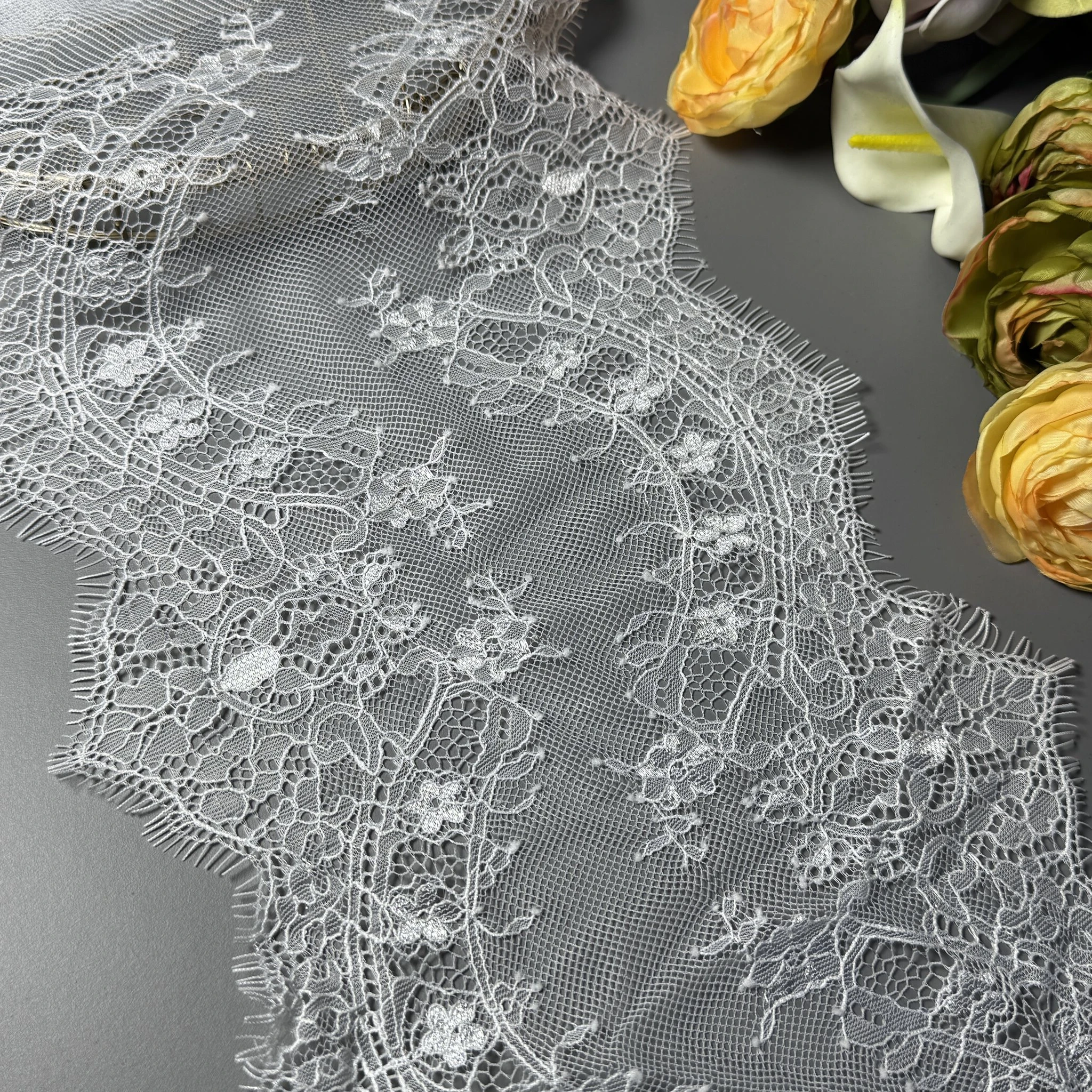 Нежное плетение, изысканный узор и легкость ткани делают это кружево идеальным для свадебных платьев, вечерних нарядов, белья и элитного декора.