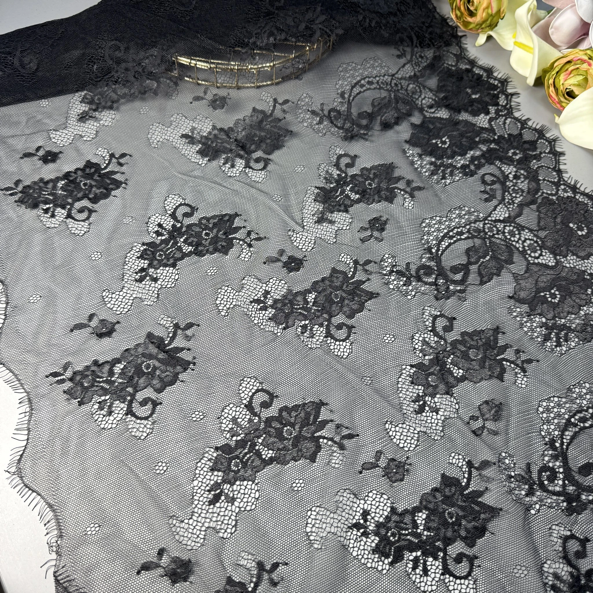 Нежное плетение, изысканный узор и легкость ткани делают это кружево идеальным для свадебных платьев, вечерних нарядов, белья и элитного декора.