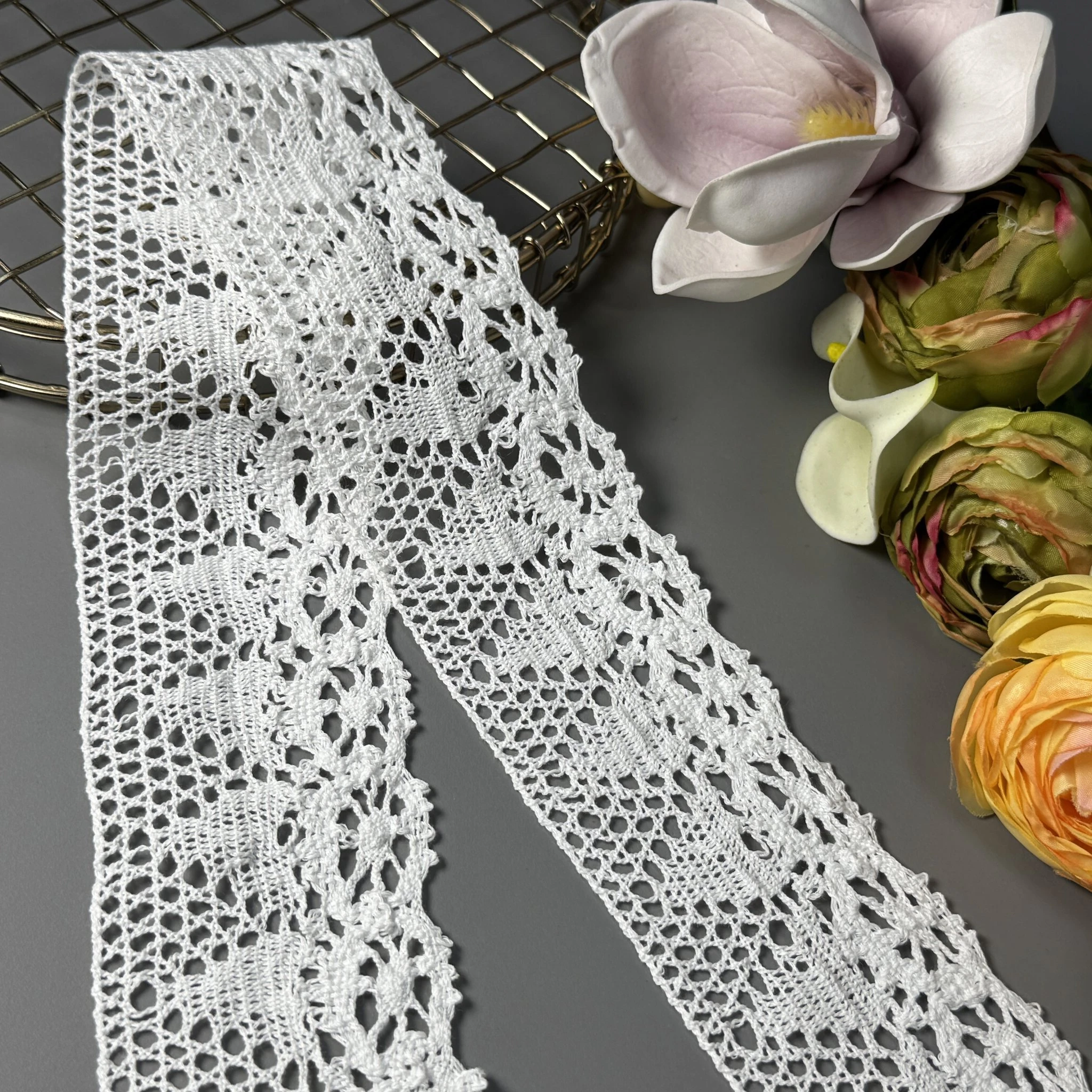 Плотное плетение и изысканный узор делают это кружево идеальным для создания платьев, блузок, аксессуаров, декоративного текстиля и изделий ручной работы.