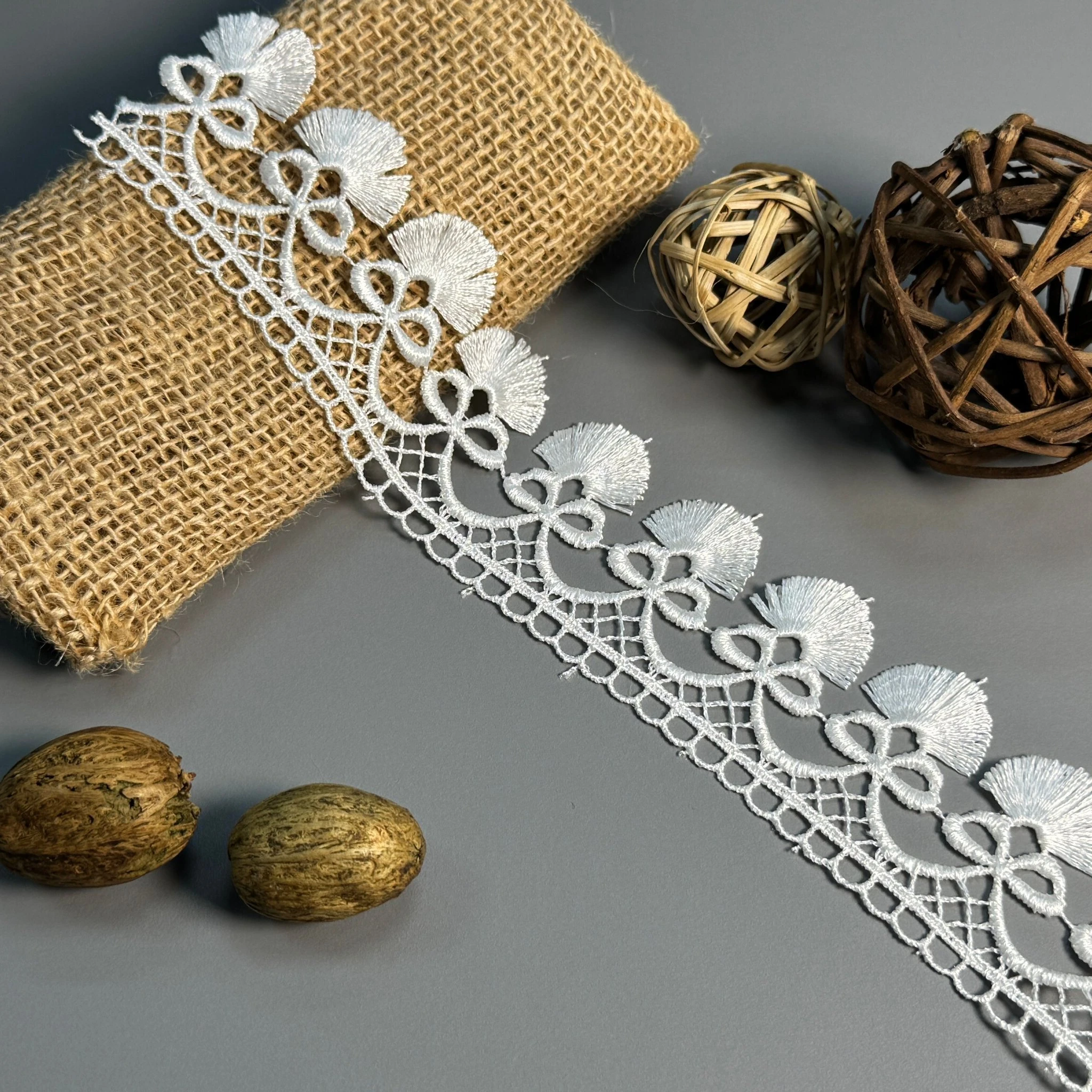 Плотное плетение и изысканный узор делают это кружево идеальным для создания платьев, блузок, аксессуаров, декоративного текстиля и изделий ручной работы.