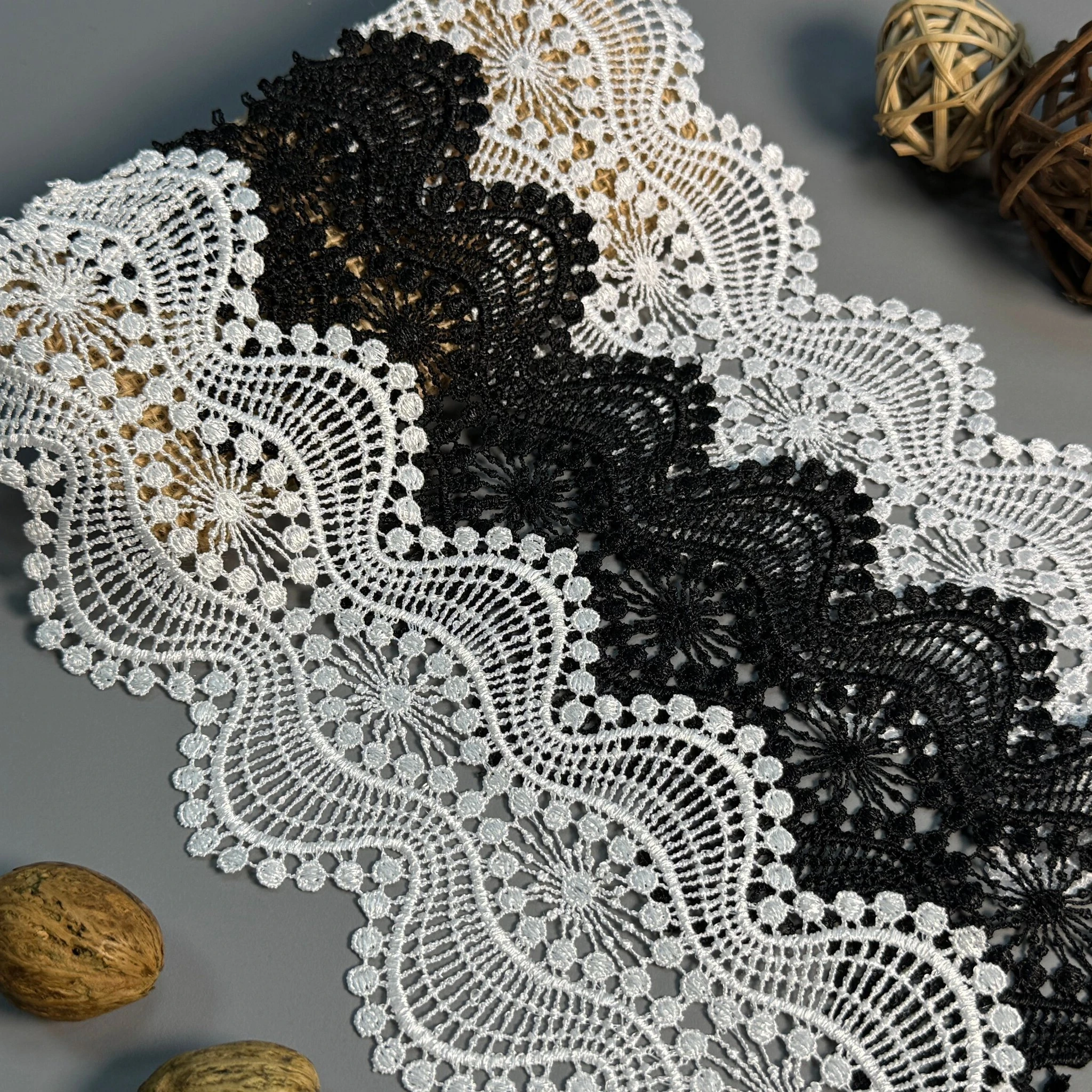 Плотное плетение и изысканный узор делают это кружево идеальным для создания платьев, блузок, аксессуаров, декоративного текстиля и изделий handmade.