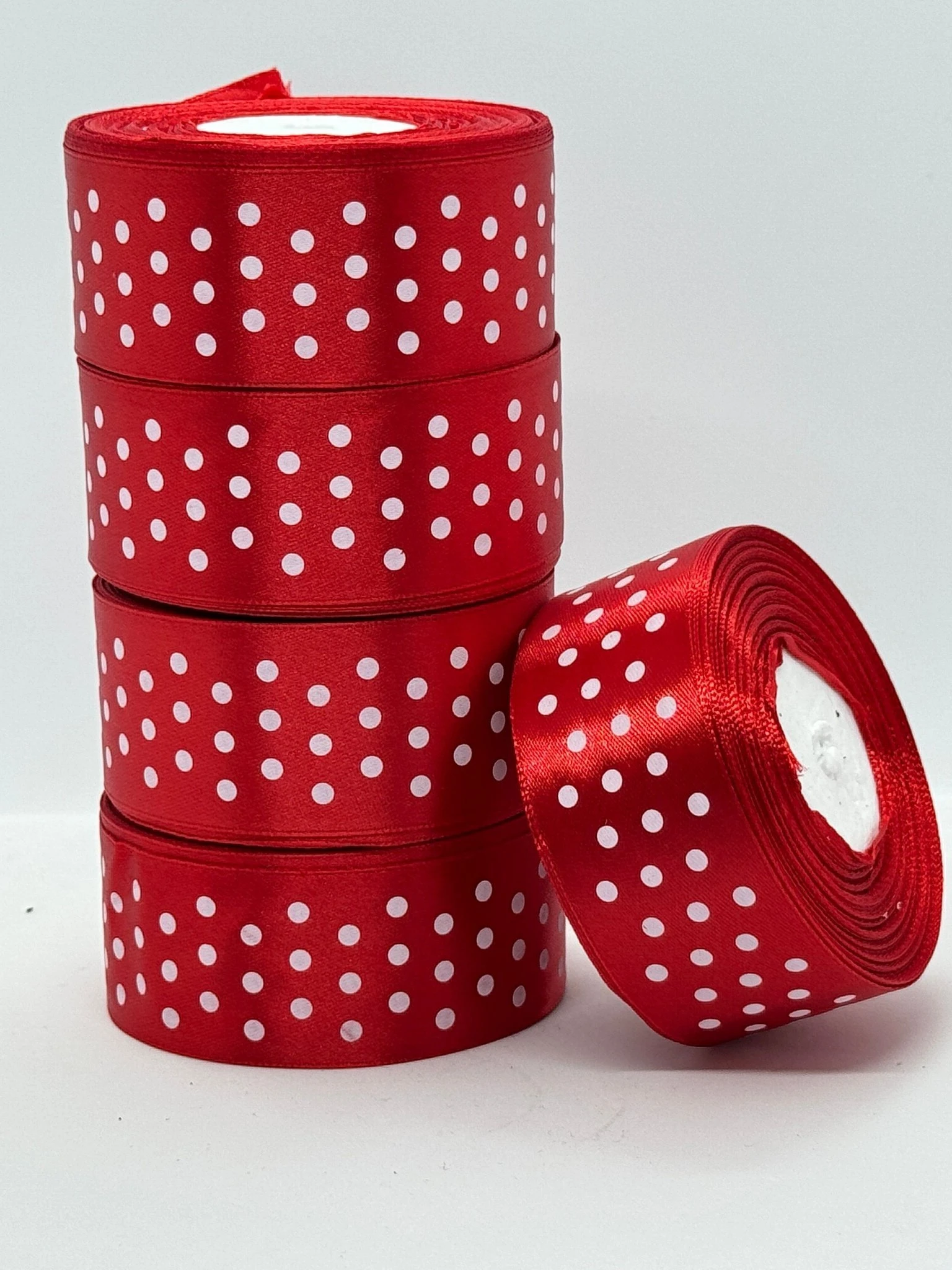 Атласная лента в горошек 4 см (33 м.), 163 червоний + білий
