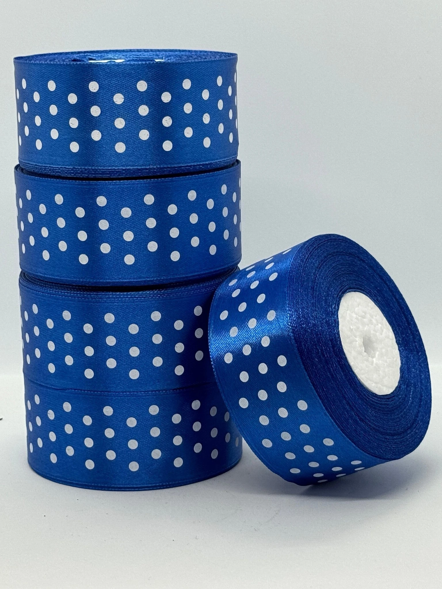 Атласная лента в горошек 4 см (33 м.), 40 електрик + білий