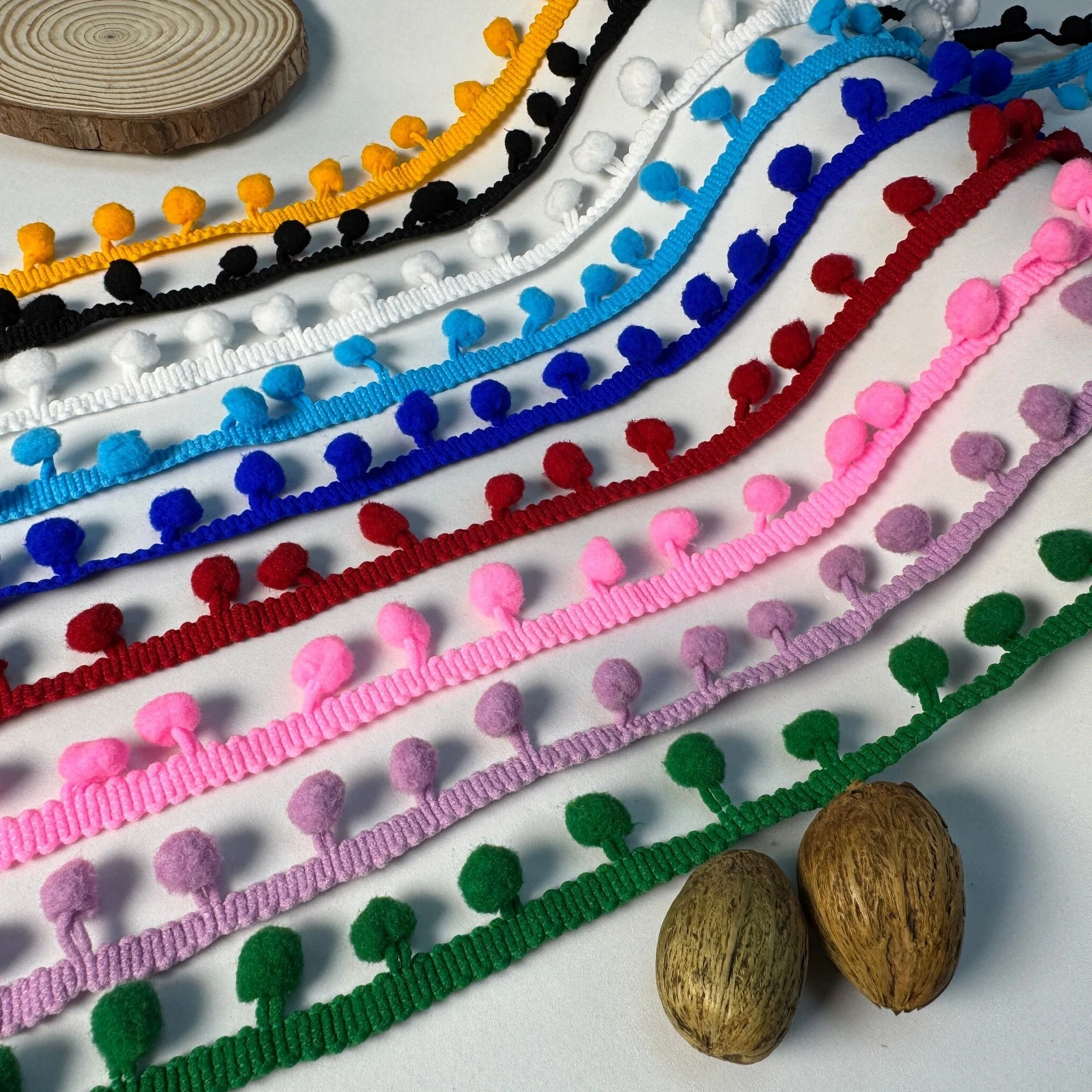 Мягкие помпоны равномерно расположены на ленте, добавляя текстуры и игривости любому декору.