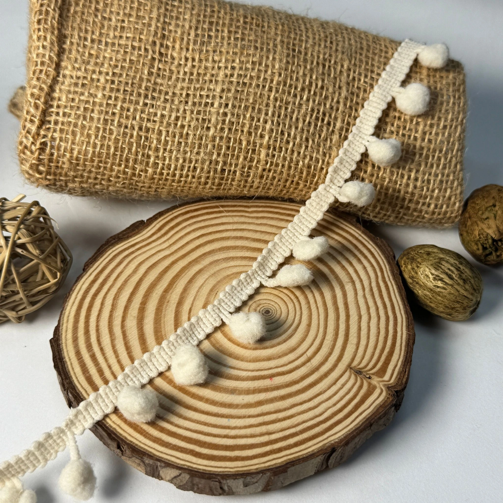 Мягкие помпоны равномерно расположены на ленте, добавляя текстуры и игривости любому декору.