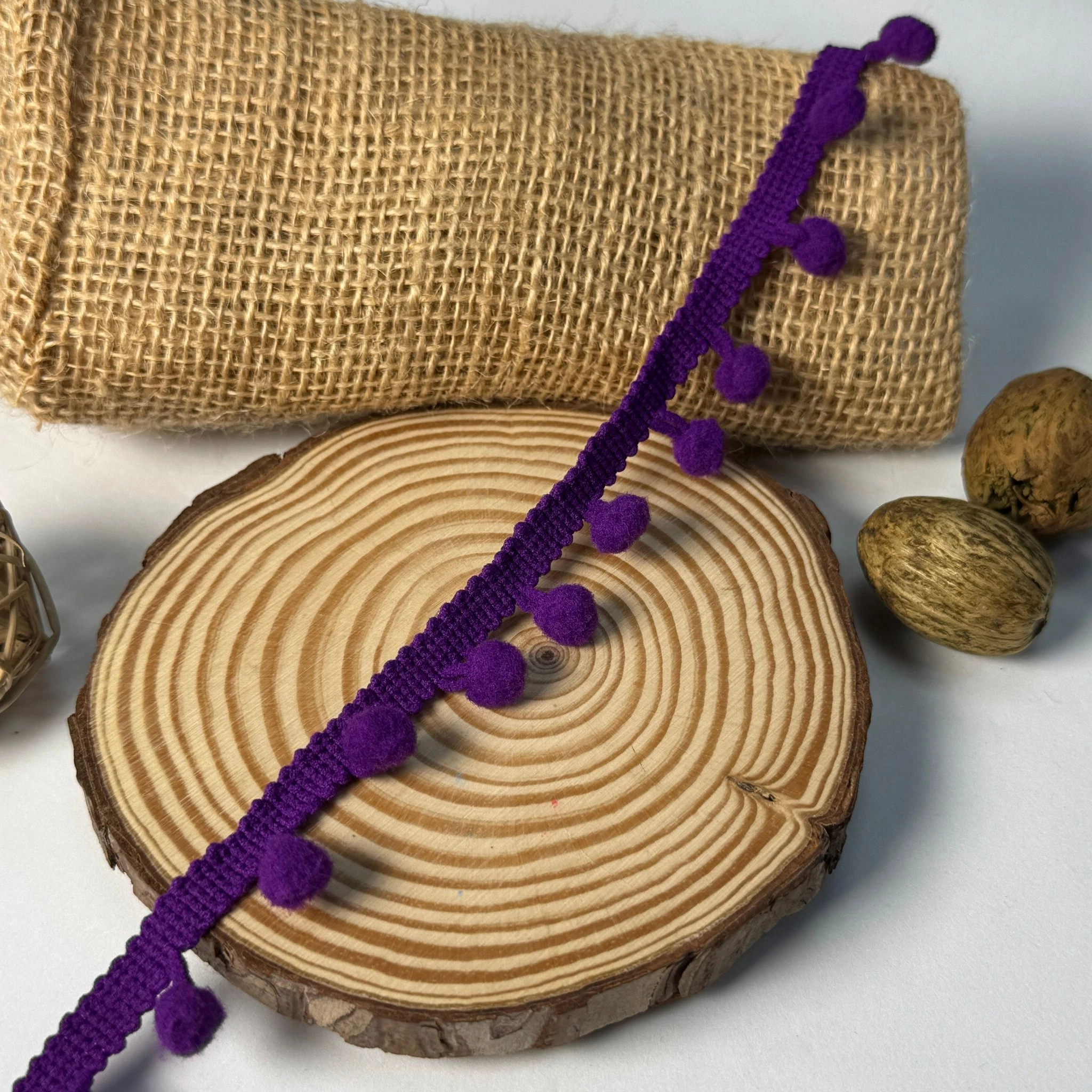 Мягкие помпоны равномерно расположены на ленте, добавляя текстуры и игривости любому декору.