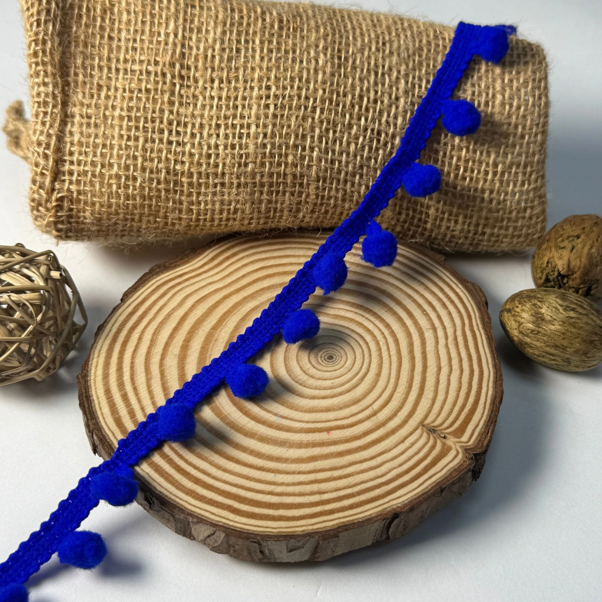 Мягкие помпоны равномерно расположены на ленте, добавляя текстуры и игривости любому декору.